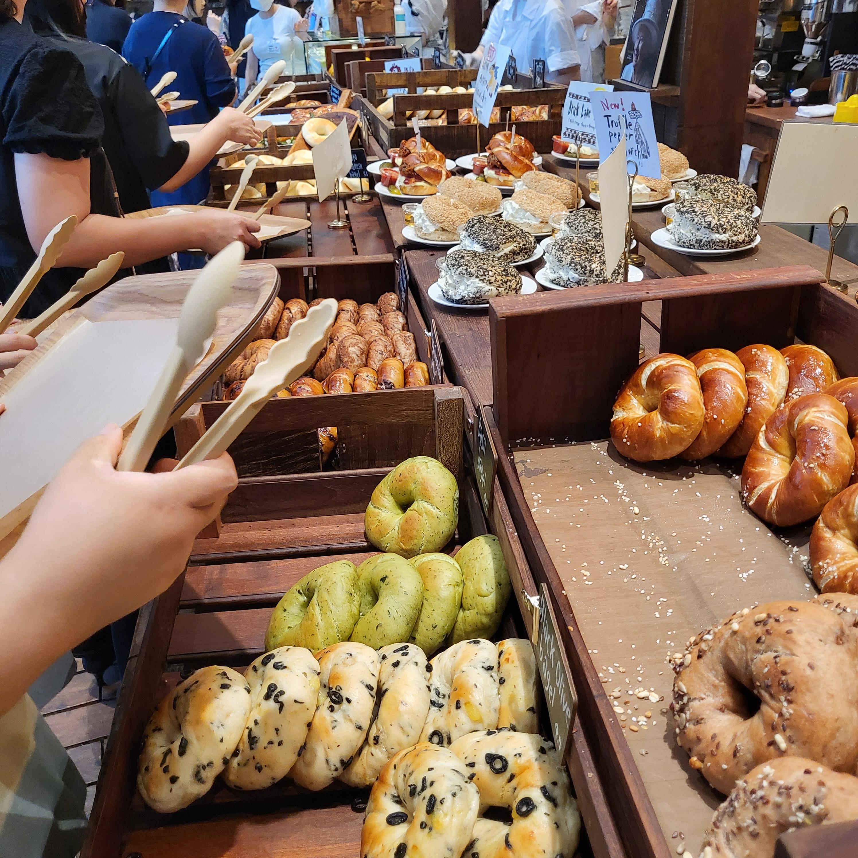 베이글은 귀여운 나무 트레이에 상품명과 함께 종류별로 담겨있는데, 줄 서서 원하는 베이글을 집게로 가져가면 된다. (빵집에서 빵 고르는 거랑 같은 방식) 인기 많은 베이글은 금방 빠지나 바로바로 채워지는 듯했다. 내 바로 직전에 쪽파베이글이 다 사라져서 못 먹는 건가 했는데, 제품 다 사라지자마자 바로 채워 넣더라는...ㅎㅎ
