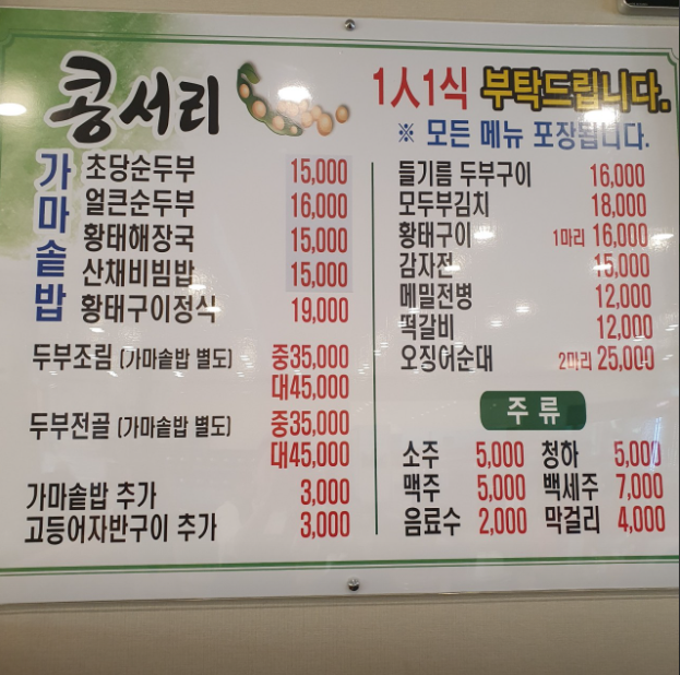 나는 '초당순두부+가마솥밥'과 '황태구이정식'을 시켰다. 설악산 등반 후 먹는 저녁이라 그랬는지 모르겠는데... 정말 맛있었다. 메뉴를 시키면 주는 기본 반찬들이 푸짐하고 다양했는데, 생선은 조금 짰었다. 근데 짭짤한 생선이랑 초당순두부의 순하고 고소한 맛이 또 묘하게 어우러지는 것이.... 나는 맛있게 먹었었고, 황태구이정식도 황태 꼬리 쪽이 너무 짰다는 것(그래서 전체 평점에서 0.5점 뺐음..) 빼고는 만족했다. 전반적으로 정말 만족스러운 저녁이었고, 가마솥에 물 부어서 먹는 누룽지랑 숭늉까지 싹싹 긁어먹고 나왔다.