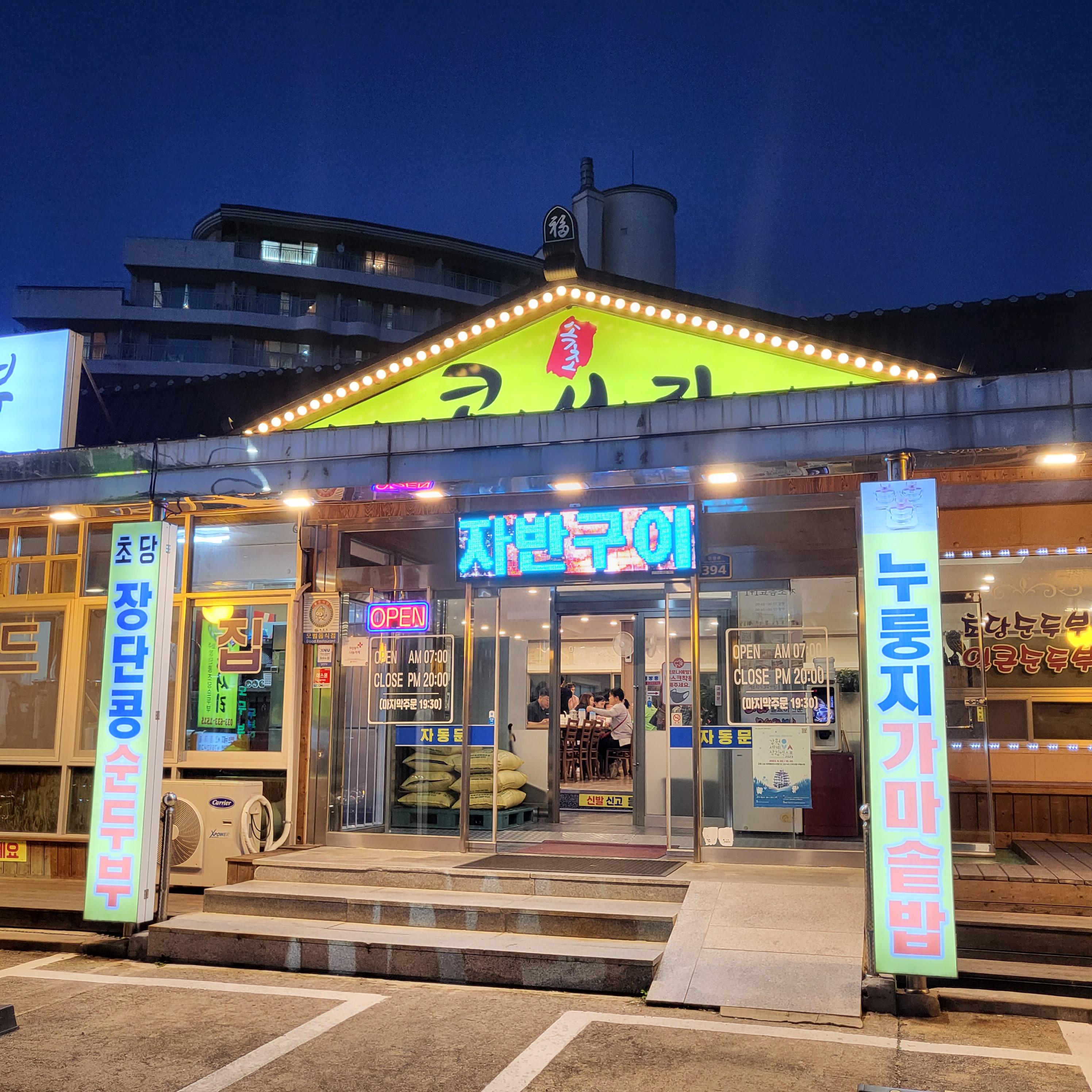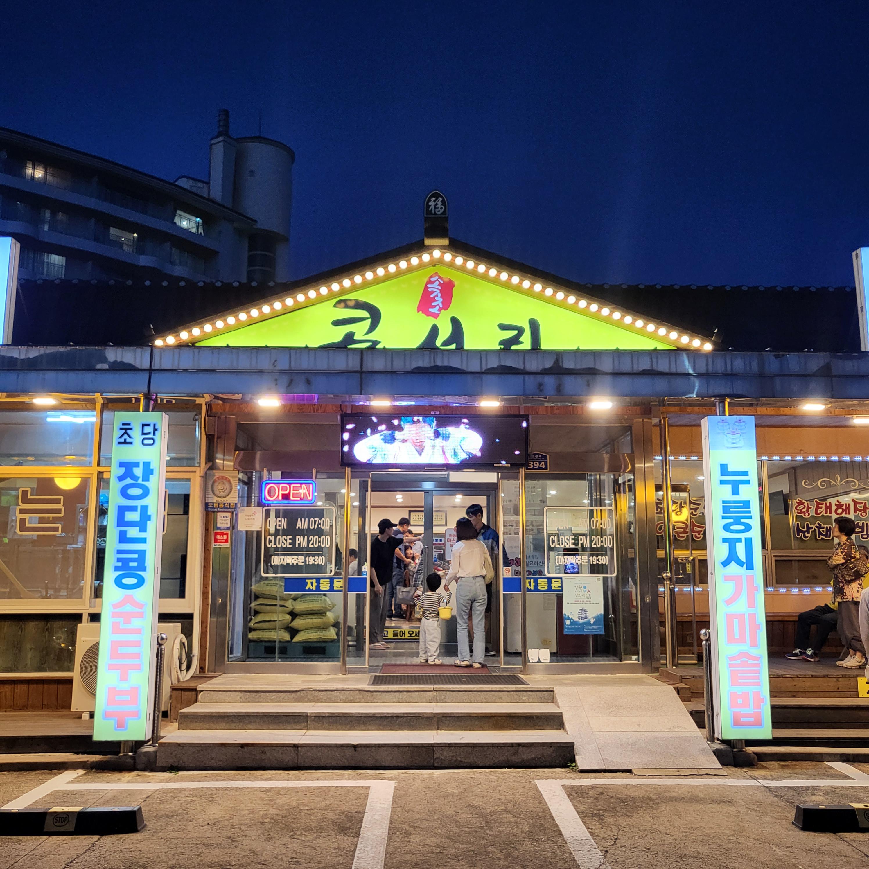 콩서리는 켄싱턴호텔 설악 직원분이 추천해 주셔서 알게 된 식당으로 켄싱턴호텔에서 자동차로 약 10분 정도 걸렸었다. (지금 찾아보니 콩서리 주변으로 설악파인리조트, 가든스파 등이 있었네... 설악파인리조트에서 머무는 사람들은 바로 코앞이라 금방 갈 수 있을 듯하다.) 콩서리 주변으로 가면 비슷한 류의 식당들이 많은데 다 인기가 많은지 어느 정도는 주차장이 차 있었던 것으로 기억한다. 콩서리 장점이라고 한다면 식당 앞에 주차장이 넓게 있어서 주차하기가 편했고, 식당들이 한 건물에 밀집된 것이 아닌 넓게 퍼져 있어서 찾기 쉬웠다는 점이 좋았다. 심지어 콩서리 간판도 아래 사진처럼 번쩍번쩍했음...ㅋㅋㅋㅋ