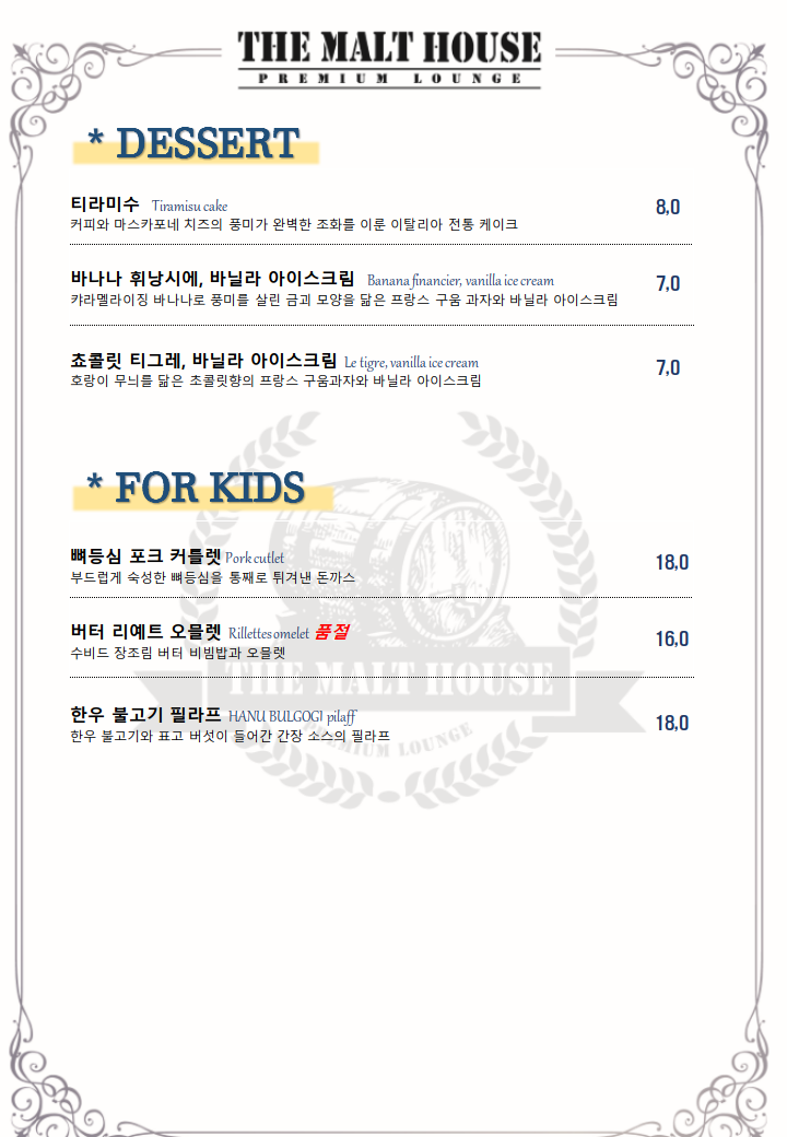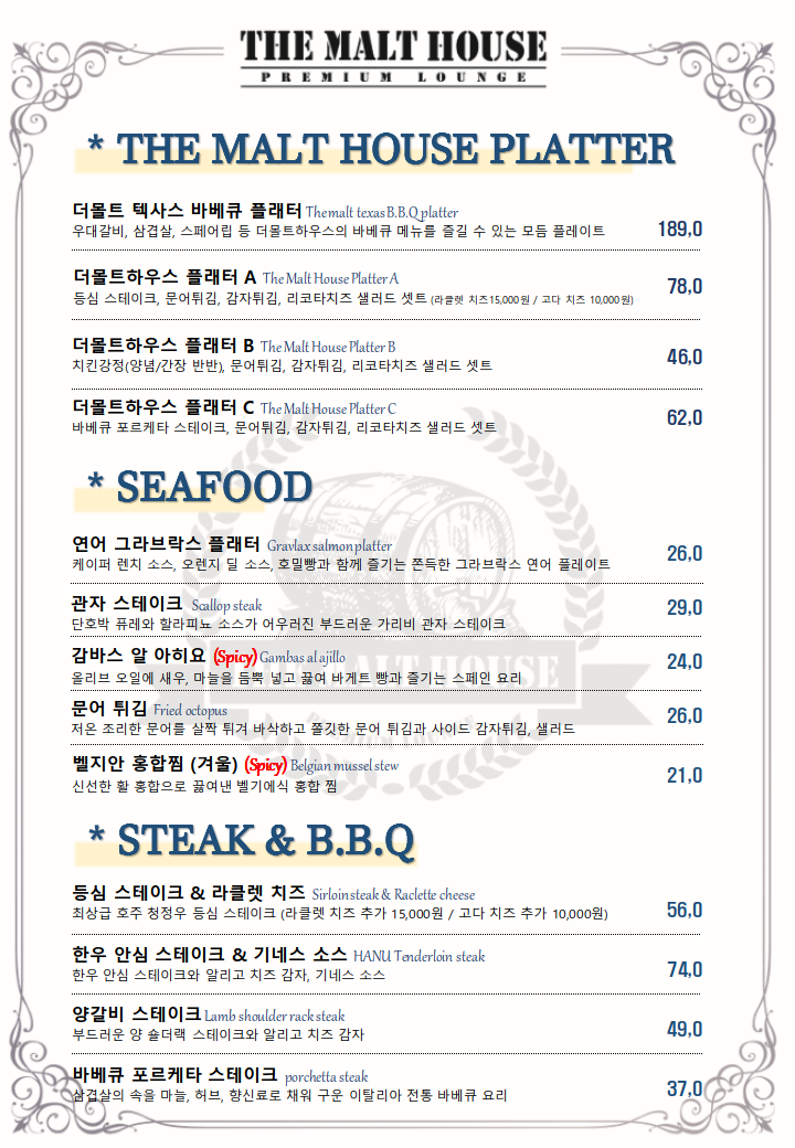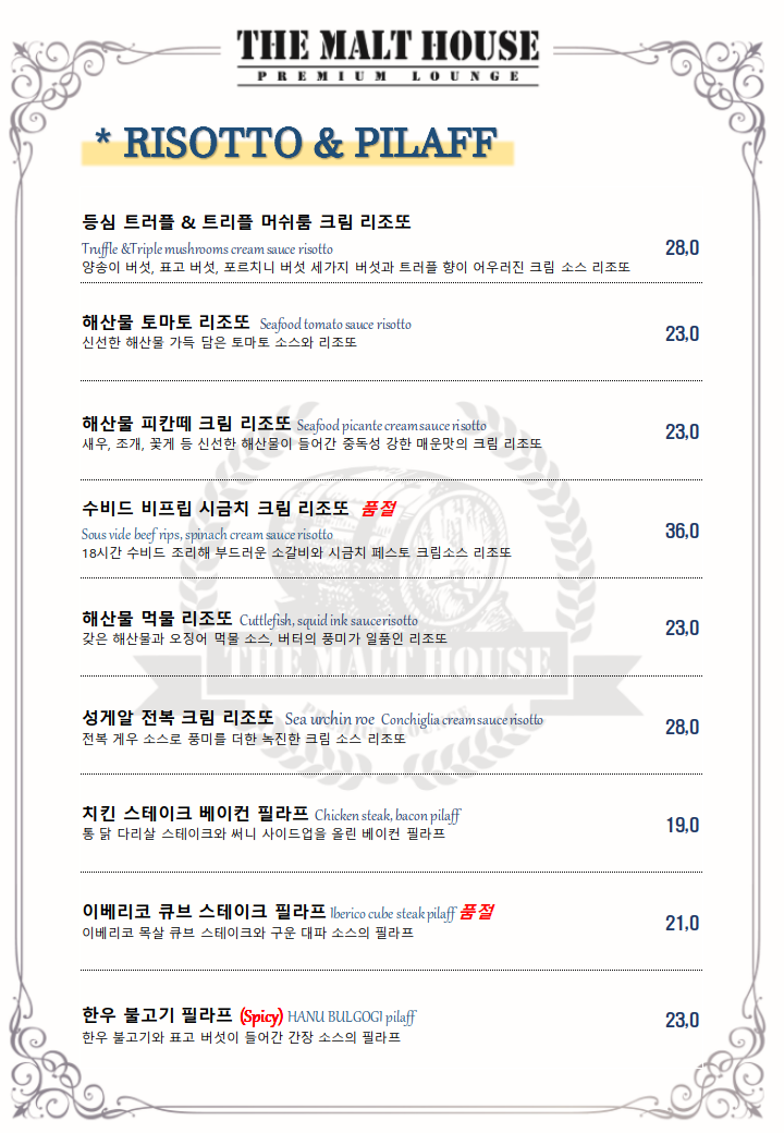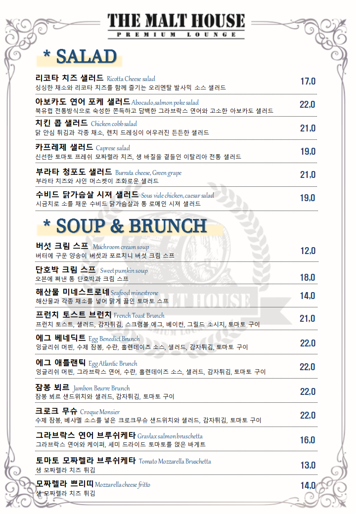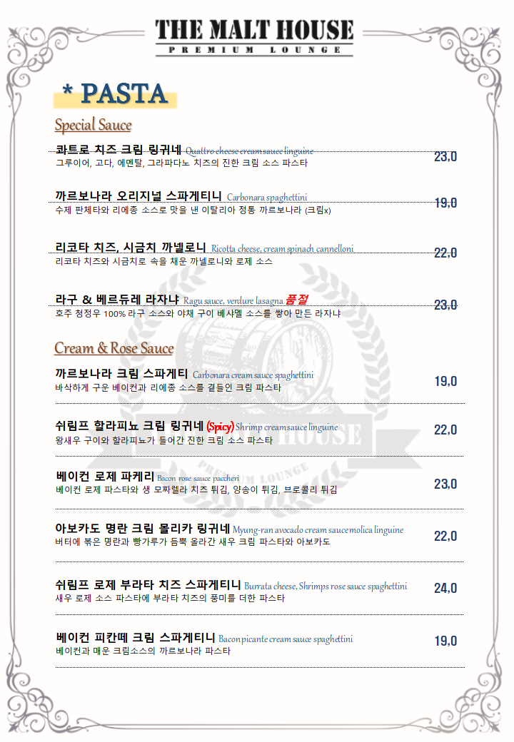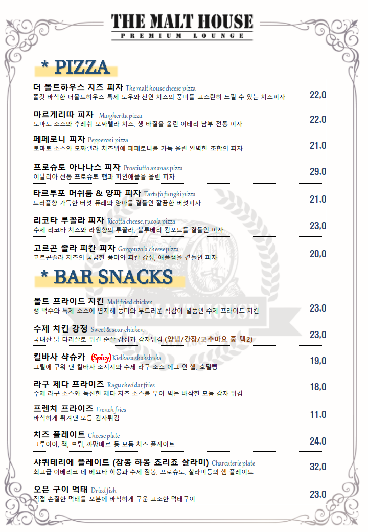 더몰트하우스는 이탈리안 레스토랑이라 역시 주된 메뉴는 피자와 파스타 종류이다. 주문은 태블릿으로 하기 때문에 메뉴판 사진을 찍기가 어려워... 부득이 메뉴판은 네이버 플레이스에서 검색하여 가져왔다. 메뉴가 상당히 많았는데 가격대가 싼 편이라고 할 수는 없지만 대부분의 이탈리안 레스토랑이 이 정도의 가격은 하는 것 같다. 게다가 여기는 분위기도 좋으니 이 정도 가격의 가치는 하는 것으로...ㅋㅋ