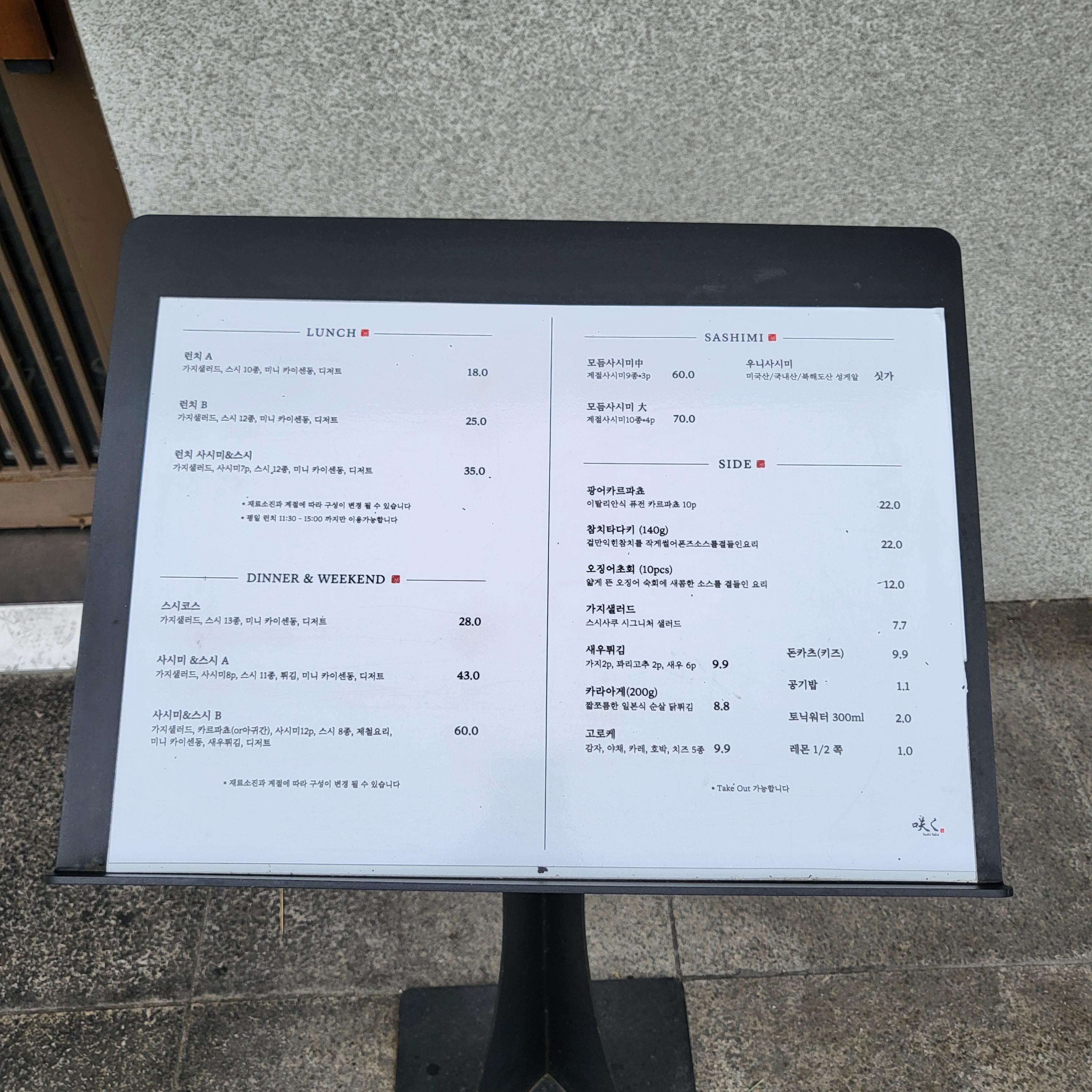 우리는 주말에 방문하여 스시세트를 시켜 먹었다. 런치세트는 평일에만 가능하다고 하니 참고하자. 주말 스시세트랑 평일 런치세트의 구성이 크게 차이 나지 않는데 가격 차이는 꽤 나서(초밥 1pc에 3000원 꼴...), 웬만하면 주중 런치에 방문하는 게 가성비를 잘 챙길 수 있을 것으로 보인다. 가격표는 아래 사진을 참고!