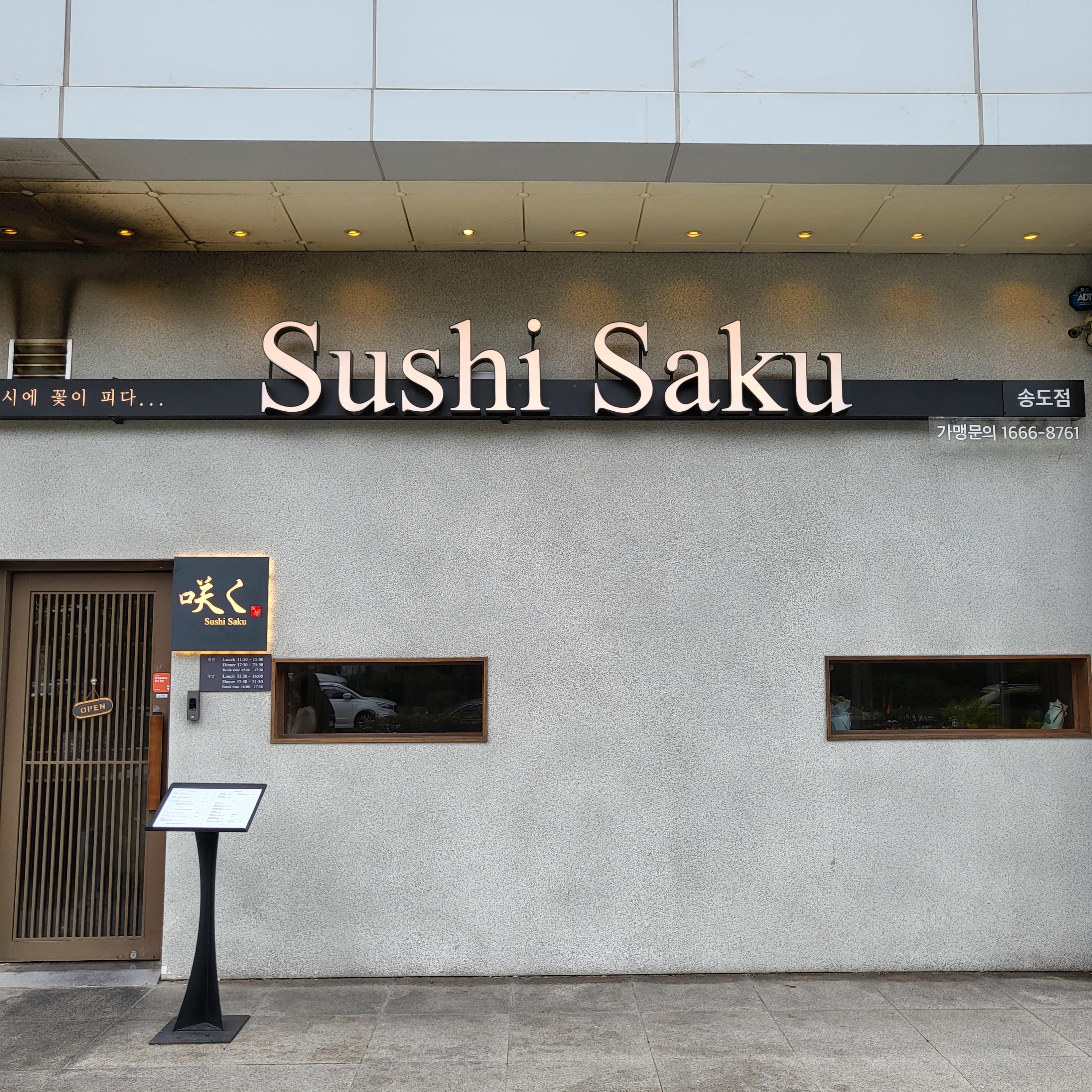 송도 스시사쿠는 센트럴파크 근처에 하나, 그리고 트리플 스트리트 근처에 하나가 있다. 내가 방문한 곳은 트리플 스트리트 근처 지점으로 지도 앱에 주소 찍고 가보면 건물 바깥쪽에 스시사쿠 간판을 쉽게 찾을 수 있다. 자차로 오면 주차 지원이 되고, 지하철로 오면 인천 테크노파크역 2번 출구로 나와서 약 10~15분 정도 걸으면 되는데 걸어 오는 길이 송도 현대 프리미엄 아웃렛을 거쳐서 오기 때문에 구경하는 재미도 있었다.