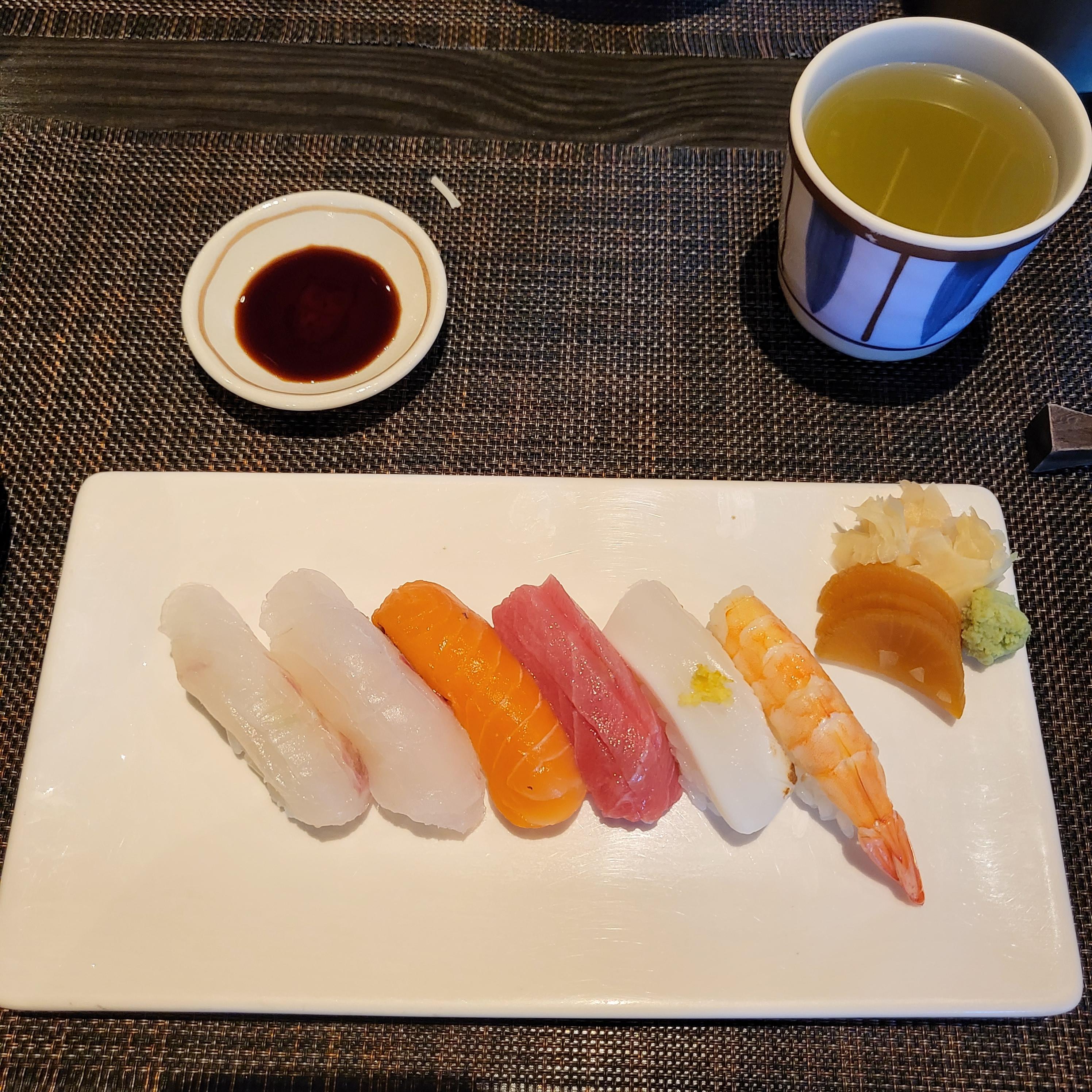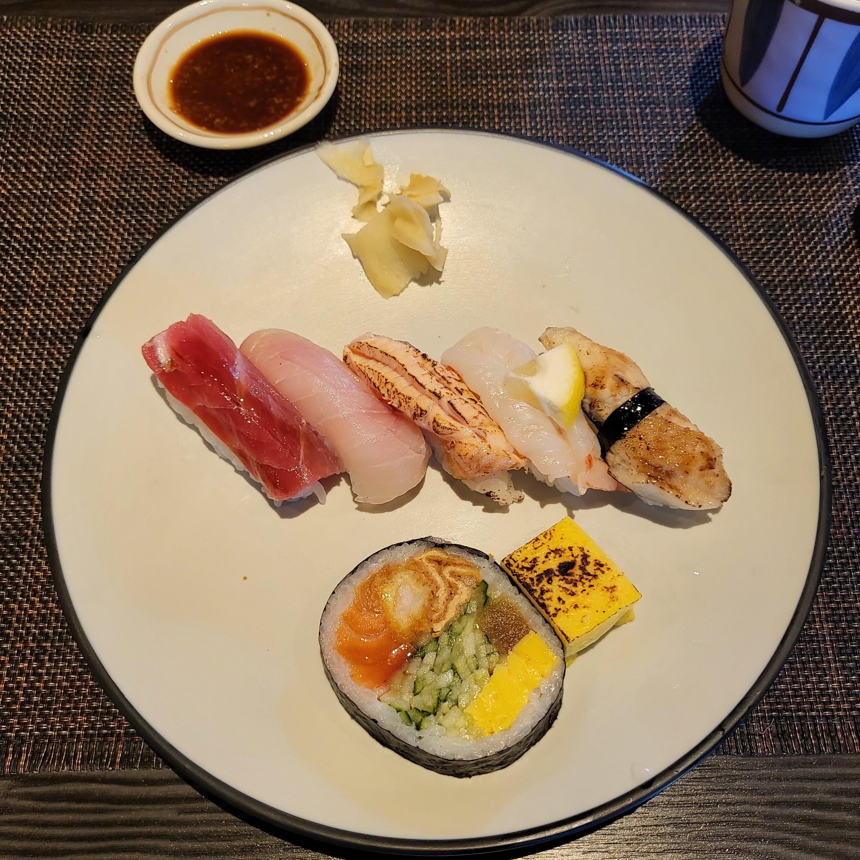 스시세트는 가지샐러드, 스시 13종, 미니카이센동, 디저트로 구성되어 있는데 구성 하나하나 빠짐없이 맛있었고 다 먹고 나니 은근 배도 불렀다.