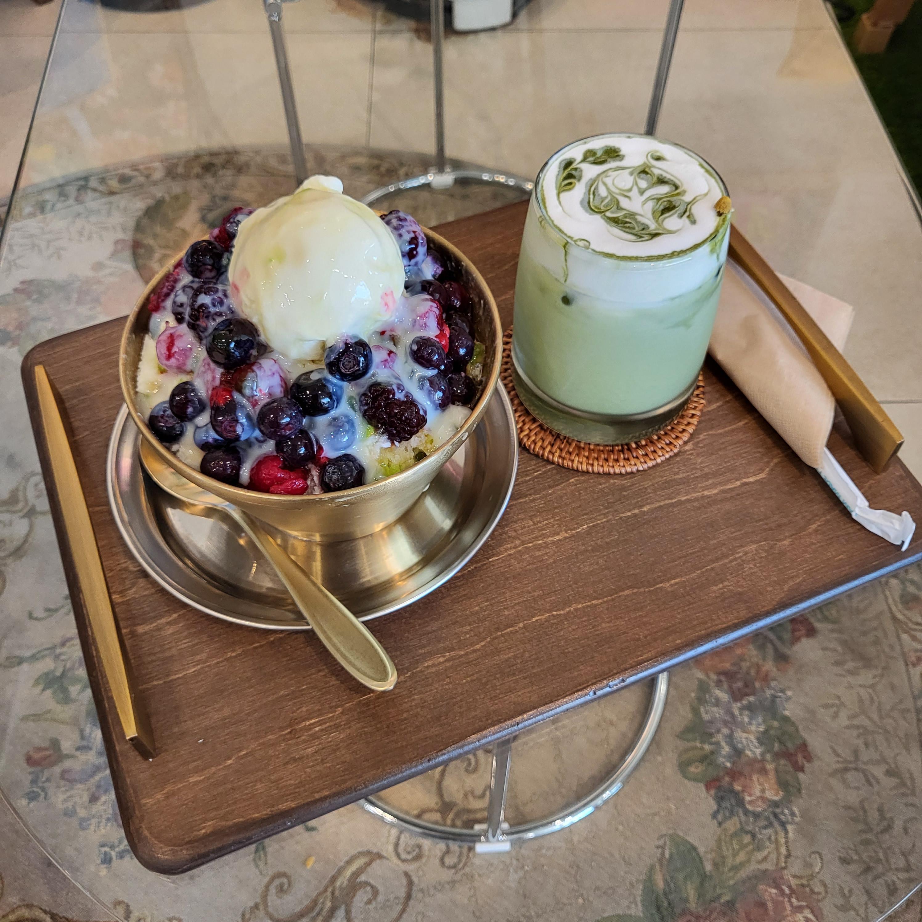 나는 시그니쳐 메뉴 중 하나인 '리틀 포레스트' 랑 베리베리 연유빙수를 시켰는데 둘 다 괜찮았다. 나는 말차를 그렇게 좋아하는 편은 아닌데 이 리틀 포레스트는 위에 크림과 어우러진 말차 맛이 꽤 맛있다는 생각이 들었다. 아, 그리고 음료 위에 아트 그려주신게 정말 이뻤다. 💕😘