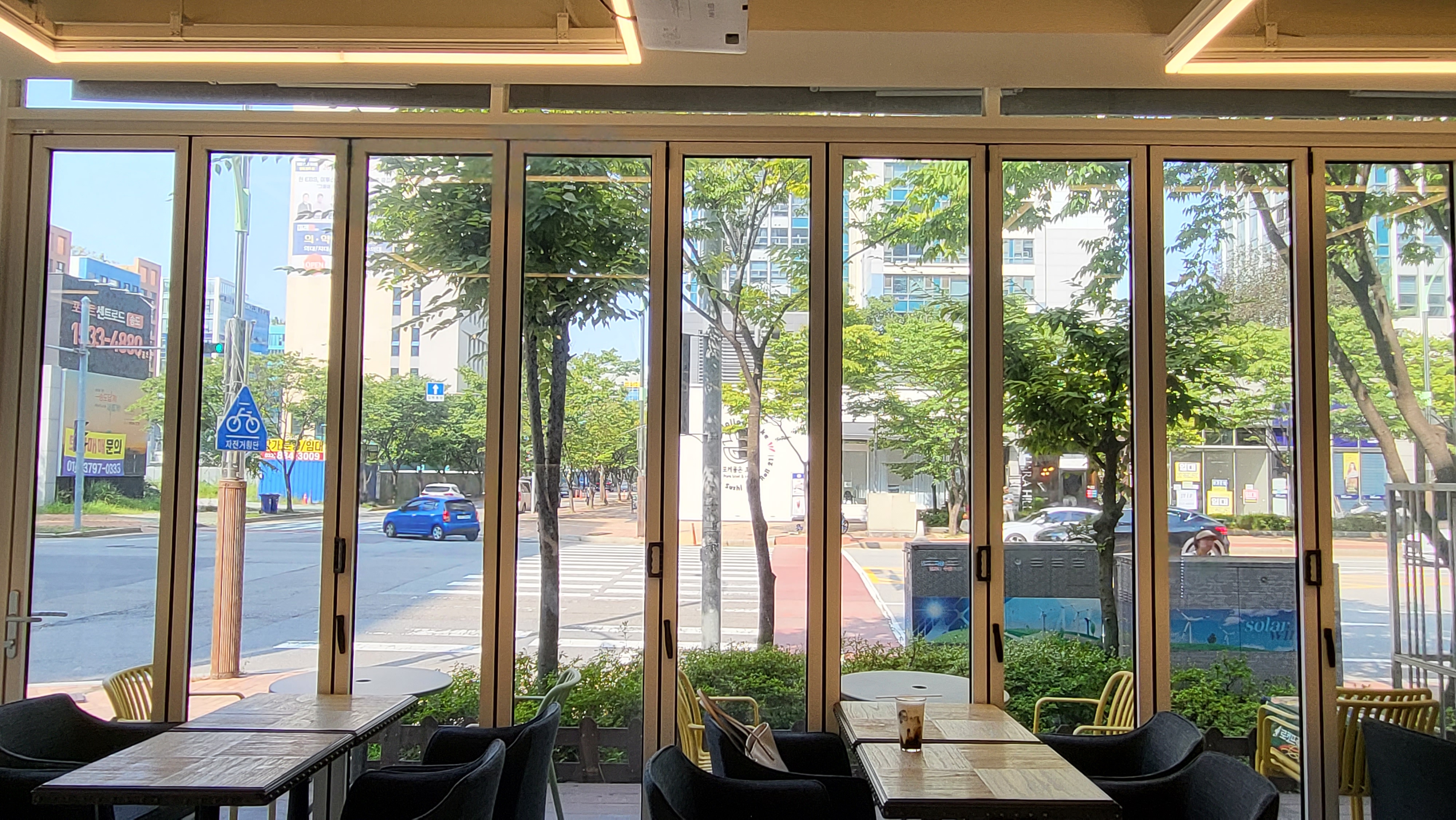 꽤 여러 개의 테이블이 있었는데, 주중이라 그런지 카페에서 커피 마시는 사람은 아무도 없었고 테이크아웃하려고 들어오는 사람들은 종종 있었다. 위에서도 말했듯이 벽면이 다 유리라 바깥이 투명하게 다 보이는데, 그날 날씨가 너무 좋았어서 자리에 앉아서 멍하니 바깥 구경하는 재미가 있었다. 바깥쪽에 가까운 테이블에 앉아서 책도 읽다가 지나가는 차도 구경하다가 보니 3시간이 훌쩍 지나 있었더라는...