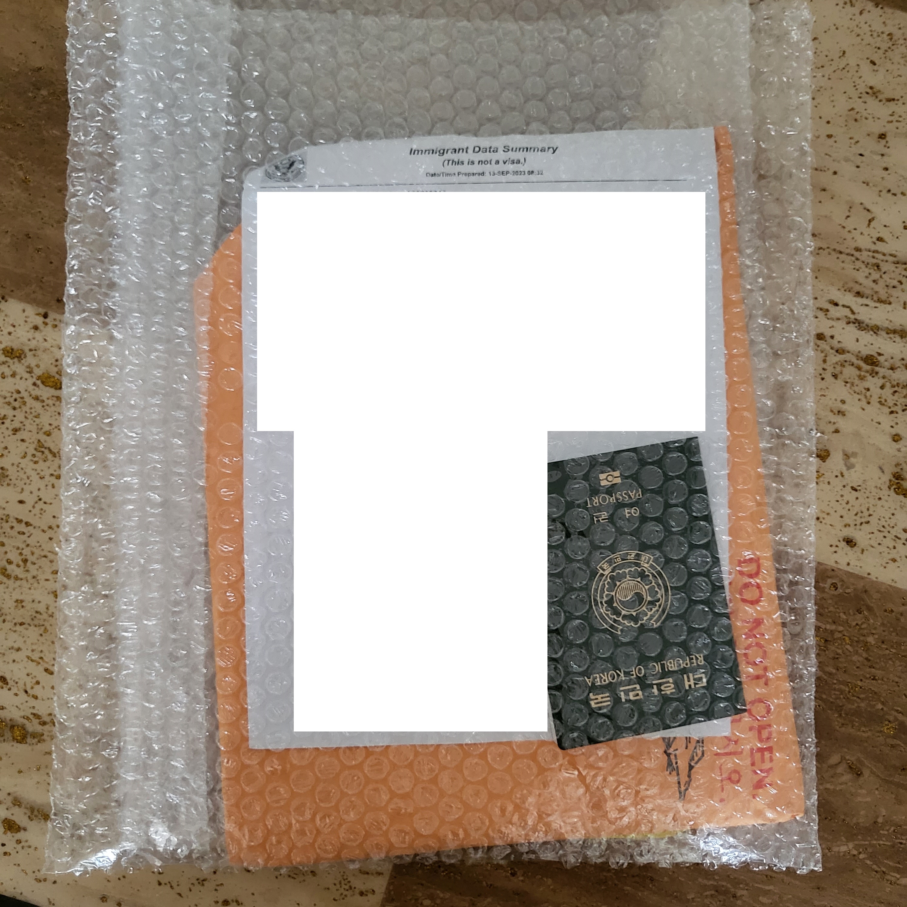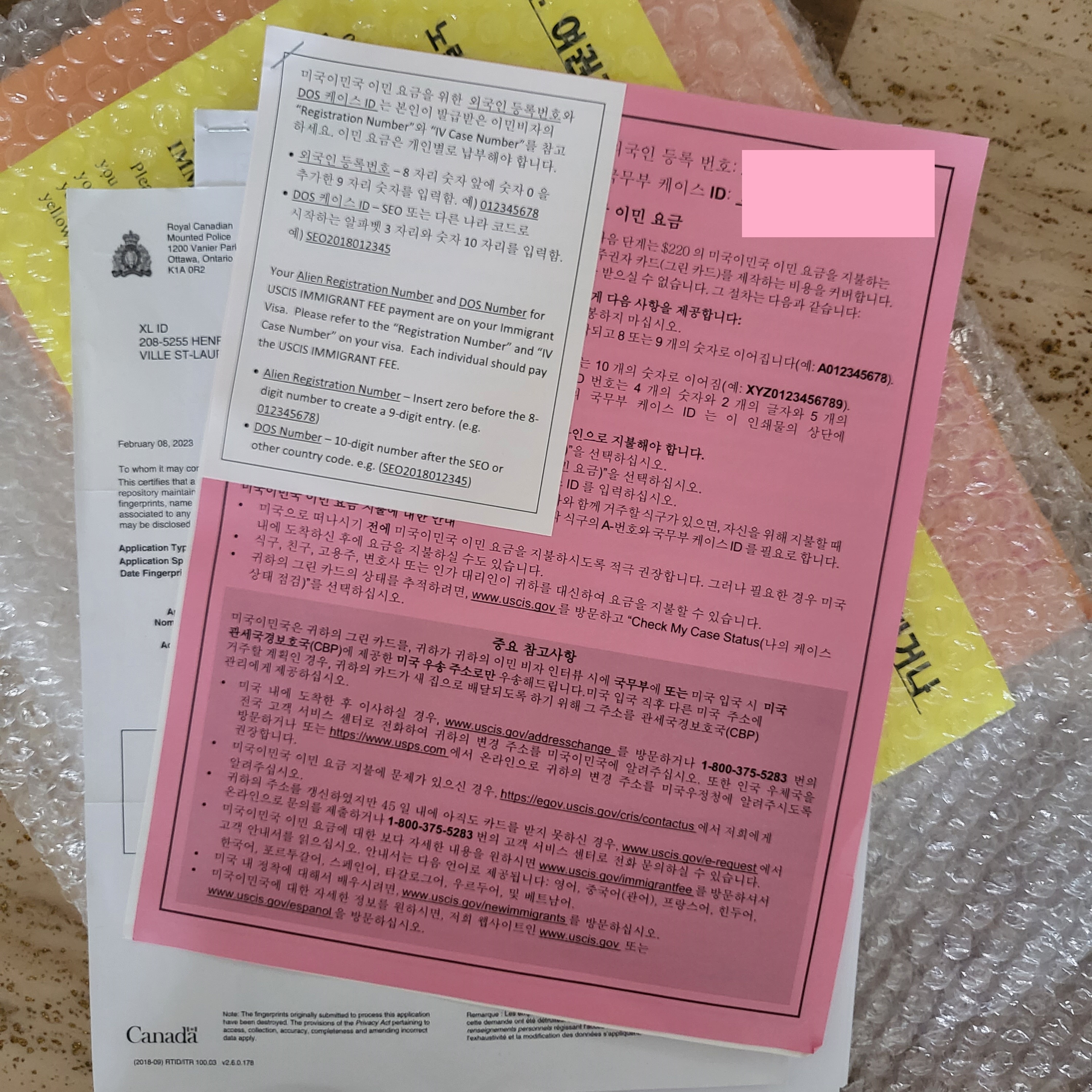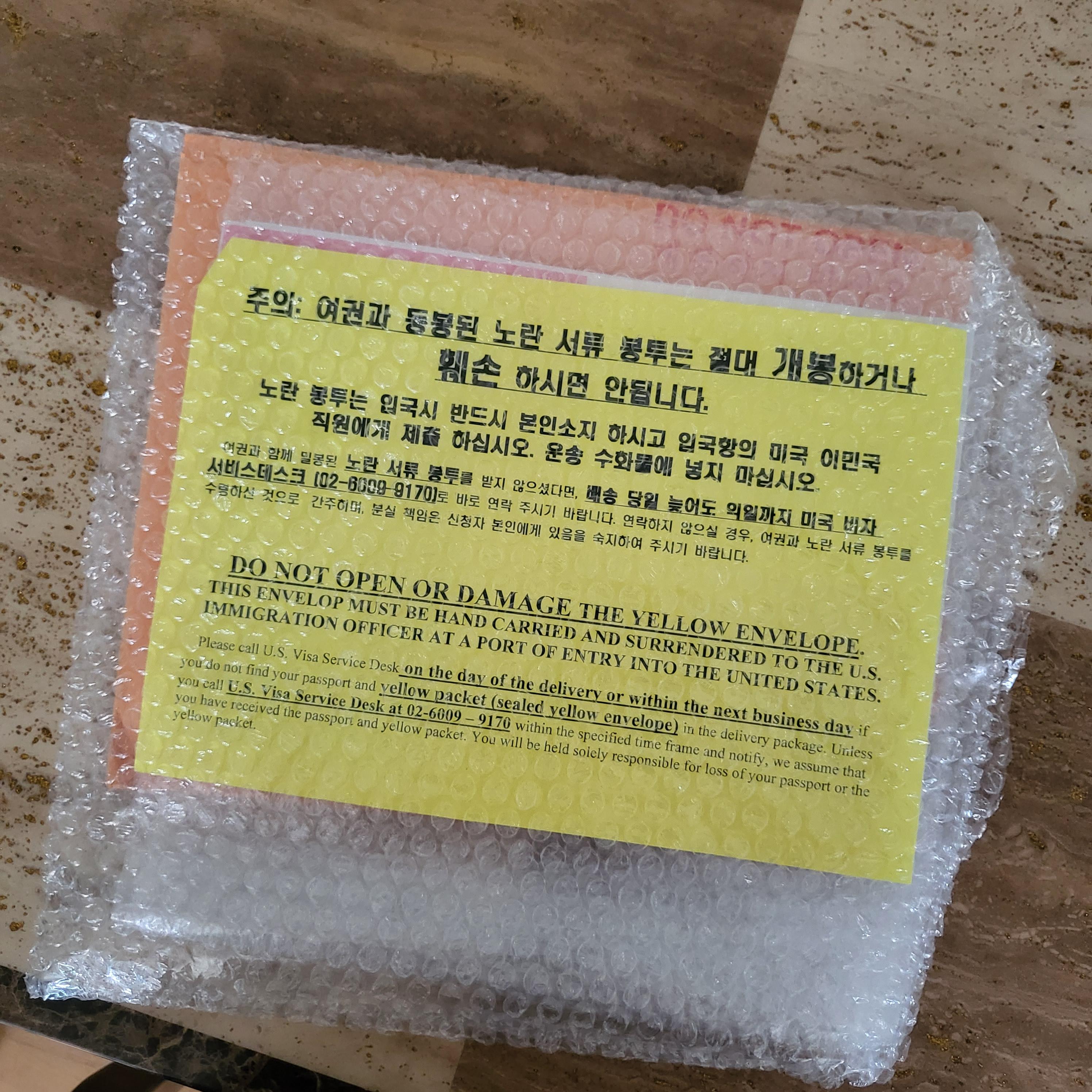 * 노란 봉투는 미국 이민국에 들어가기 전까지 절대 열지 말라고 되어 있다. 나는 한 번 실수로 땅에 떨어트린 적이 있는데 다행히 뽁뽁이로 잘 싸여 있어서 봉투가 손상되진 않았다.... 그때 십 년 감수한 이후로는 상전 모시듯이 가지고 있다. 참고로 노란 봉투의 한쪽 귀퉁이는 원래 잘려져서 배송된다. 한쪽 귀퉁이가 잘려져 있는 건 손상된 거 아니니 걱정하지 않아도 된다.