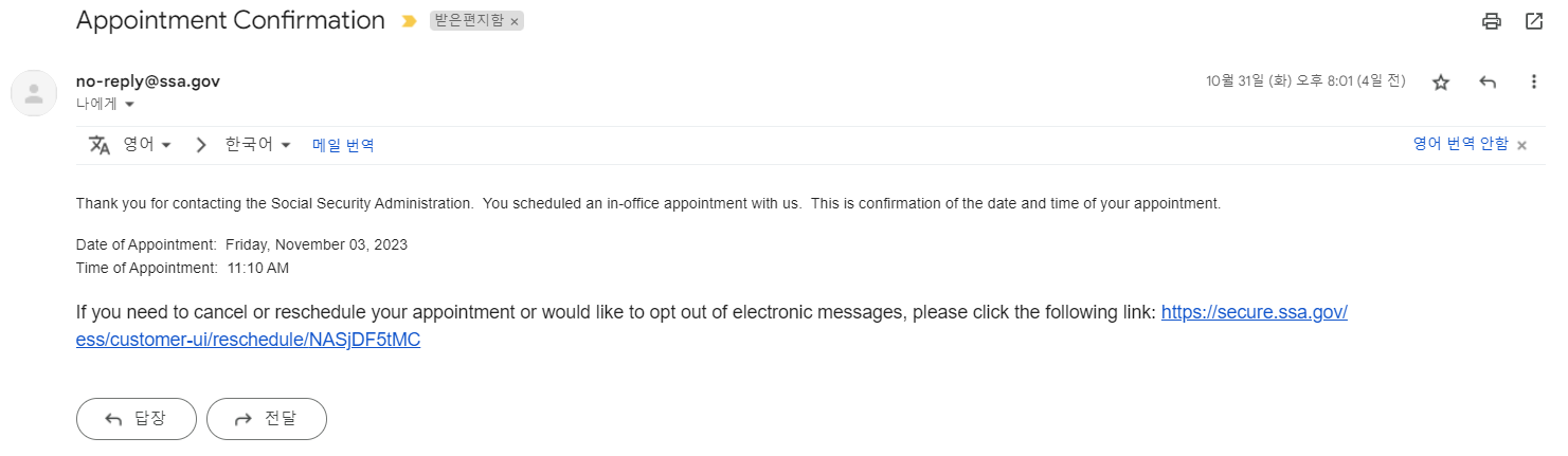 3) 2023년 11월 3일이면 입국한 지 3주가 되는 시점이었고, 11월 3일 오전까지도 메일함에 SSN 카드는 오지 않은 상태였다.