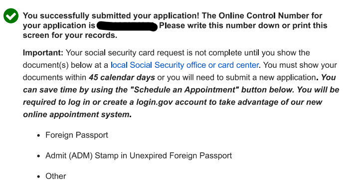 4) 'Exit'까지 누르고 나면 아래와 같은 화면이 나오는데, pdf로 저장하거나 Online Control Number를 따로 적어놓거나 하자. 그리고 아래 설명대로 화면에서 'Schedule an Appointment' 버튼을 눌러 로그인한 후(Login.gov 회원가입 필요) 내 주변의 Local SSA 사무실을 찾아 방문 가능한 날짜와 시간으로 예약을 잡으면 된다. 내 경우, 가장 가까운 SSA office in Temple의 가장 빠른 방문 가능 일정이 12월 27일이라... 10분 정도 더 먼 Georgetown, Texas로 위치를 변경하여 예약을 잡았다.