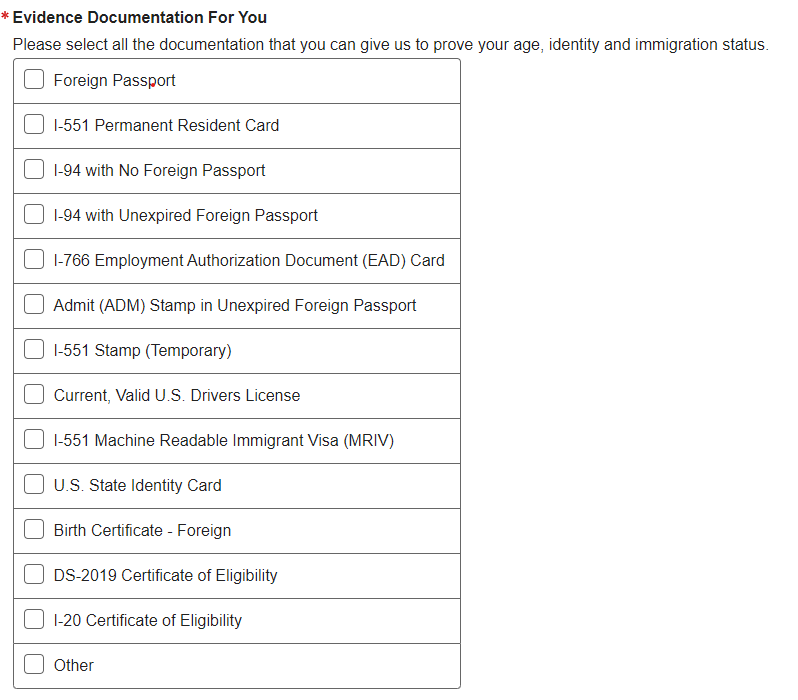 2) SSN을 신청할 때는 내 비자 및 신분 상황에 맞는 자료를 준비하여 age, identity, and U.S. citizenship or lawful alien status를 증명해야 한다. 아래 캡처는 온라인 신청 시에 체크해야 하는 항목을 발췌해 온 것으로, SSA에서 받아주는 자료로 볼 수 있다. 중요한 점은 증빙 서류는 2가지 이상이어야 하며, 모든 서류는 원본이거나 발급 기관에서 인증한 사본이어야 한다. (Photocopies or Notarized copies 들은 Unacceptable 하다고 함.) 좀 더 자세한 정보는 아래 '더 보기'란에 추가해 두었으니 참고.