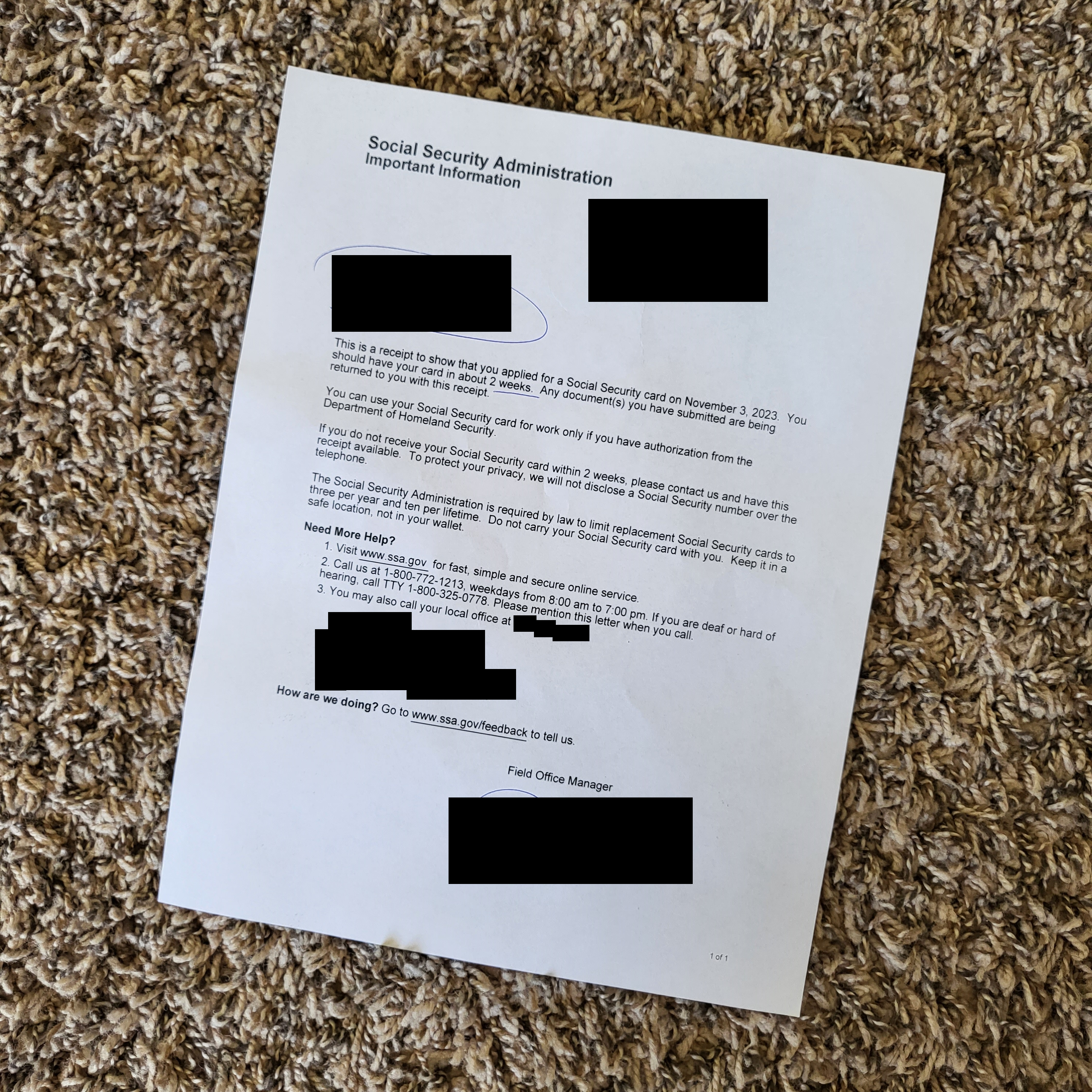 9) 창구로 가서는 가지고 온 자료를 담당자에게 제출하고 이것저것 궁금한 점들을 물어봤다. 내 담당자분은 인쇄해 간 SS-5 Form 은 가져가셨고 여권과 Military ID는 돌려주셨다. 그리고 SSN 발급 요청 처리 완료 후 Receipt 도 함께 주셨다.